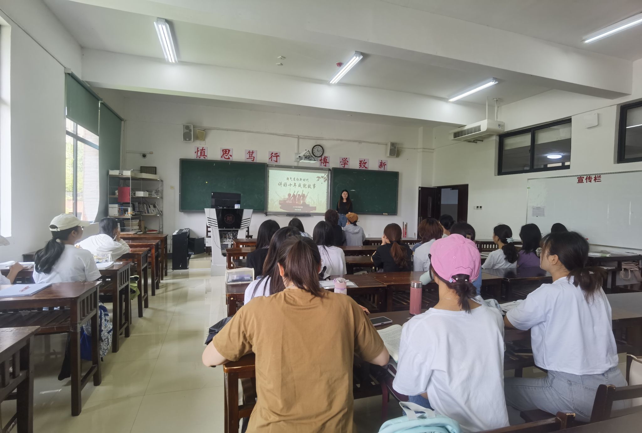 各班结合公司实际要求,分别从经济、政治、文化、社会、生态文明等不同角度展现十年间取得的进展与成就,通过观看视频、主题报告等形式讲好身边十年成就故事,引导同学们深刻领悟非凡十年里祖国强大的前进动力来源。同学们纷纷感慨祖国这十年的变化之大,并表示会以景仰之心礼赞新时代十年的发展与成就。