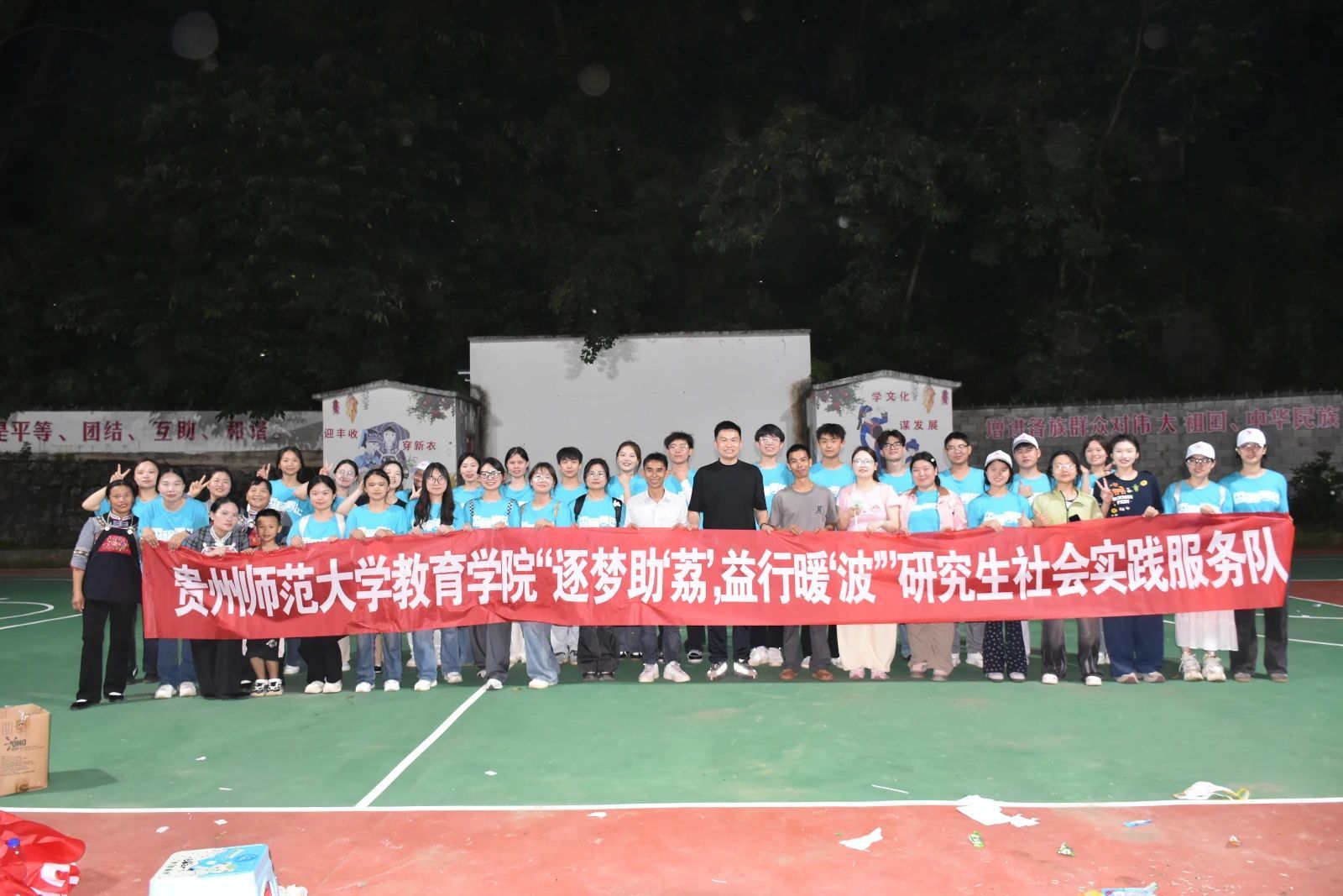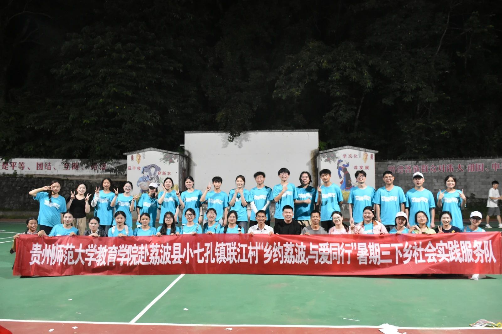 在离开的前一天,实践队与联江村村委会联合举办了联欢晚会。晚会上,志愿者与村民积极互动,将现场气氛不断推向高潮。村民亦倾情献演本地特色歌舞,赢得在场观众阵阵掌声。最后,全体实践队员与村“两委”合影留念,晚会在热烈、温馨的氛围中落下帷幕。