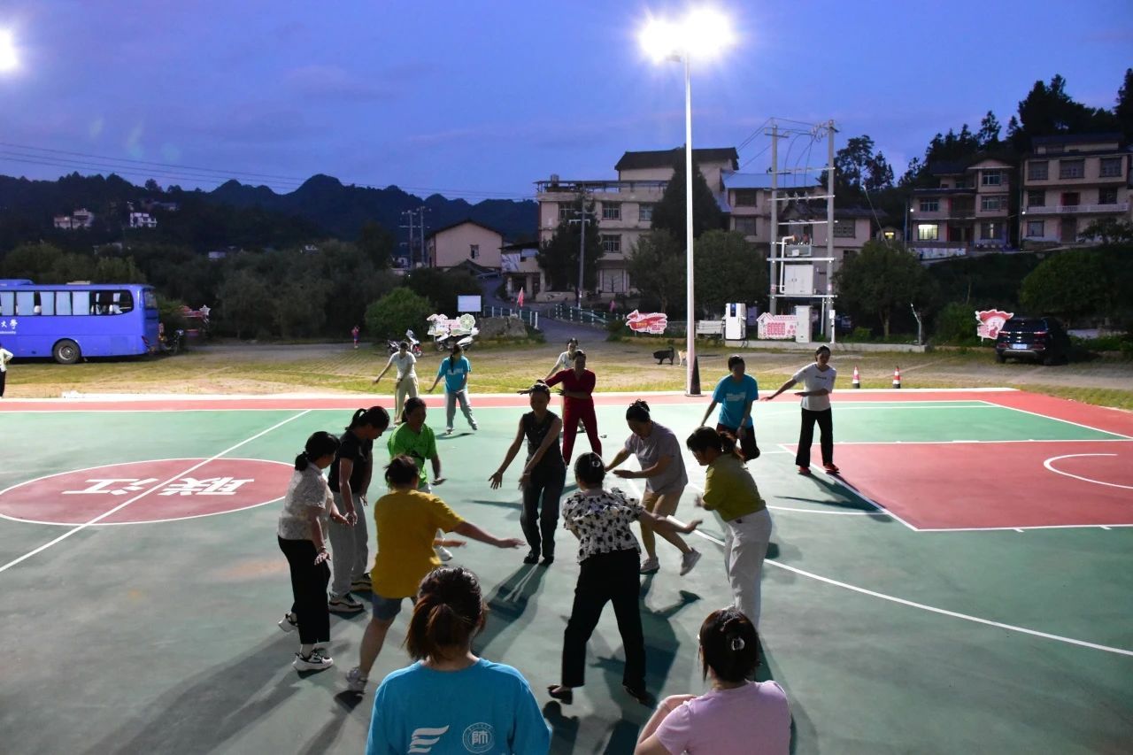 实践队结合当地民族特色,为村民们编排舞蹈,参加的既有充满活力的年轻姐姐,又有精神抖擞的阿姨和奶奶,队员们从最基础的舞步教起,一遍遍示范,一点点纠正,场地上充满了欢声笑语。