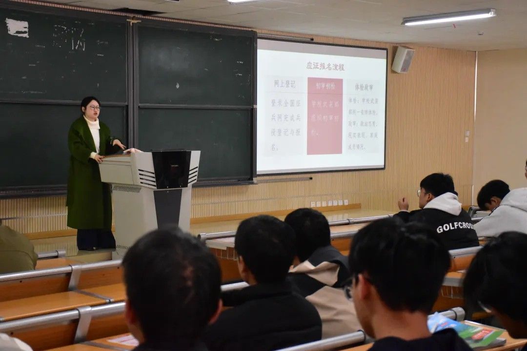 为响应国家号召,激发同学们投身军营的热情,公司积极组织开展2026年春季征兵宣传动员大会。征兵工作联络员胡懿园从应征入伍条件、当兵优惠政策、体检注意事项三方面向同学们进行宣传讲解,帮助大家全面了解相关信息。