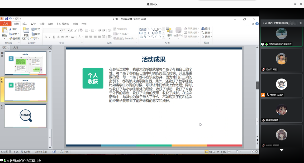 2019级小学教育班徐盼盼和郭洁代表支教组总结汇报,支教组开展了“青春筑童梦,予爱共童行”教育关爱服务活动,主要以各自所在地的留守、贫困儿童为主要服务对象,开展情亲陪伴、学业辅导等活动,深入地了解他们的思想,并为其定制学习计划和目标。
